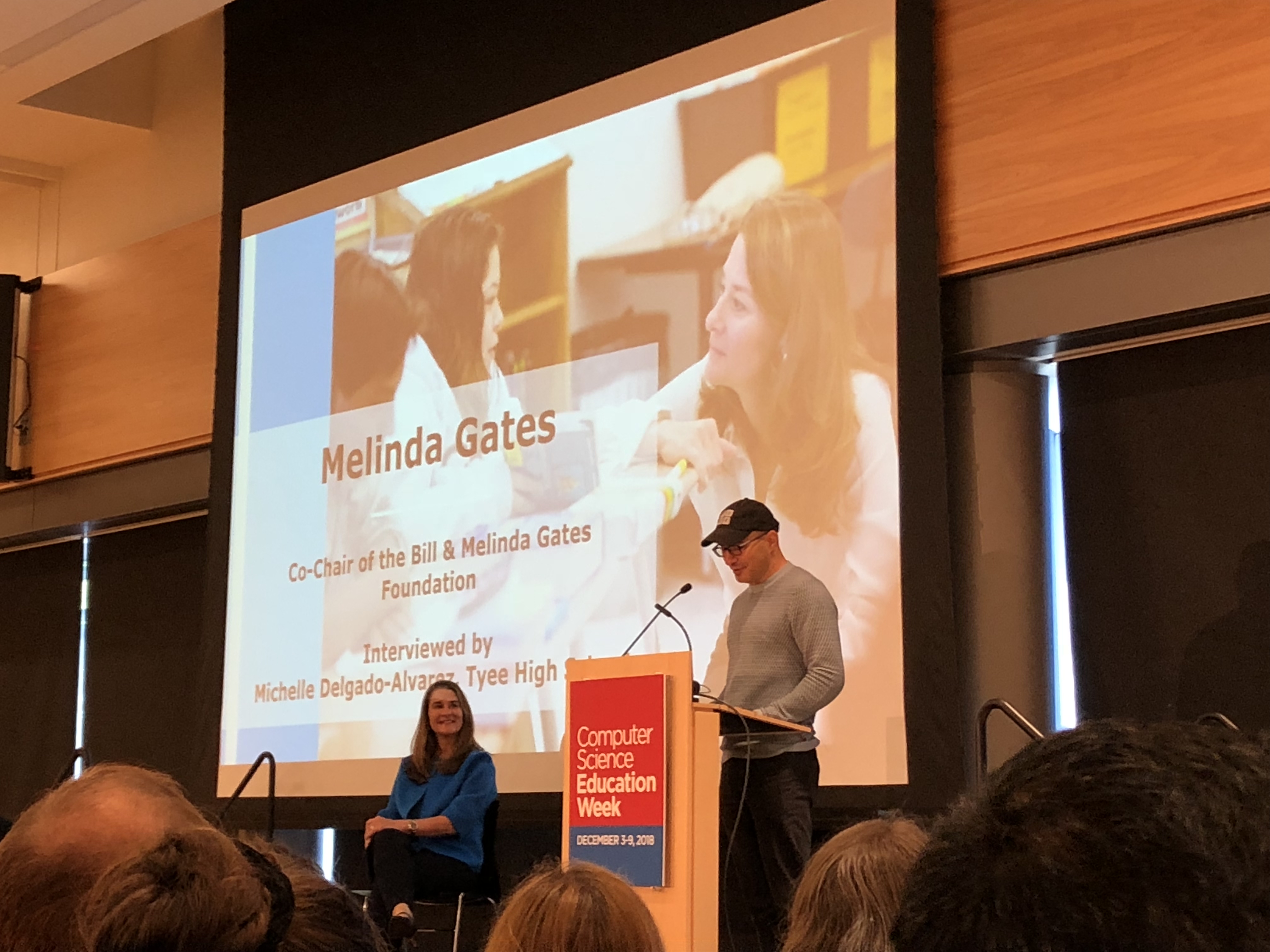 One of the most influential and important philanthropists of our time, Melinda Gates, was a perfect speaker to kick off the CSEdWeek Kickoff Event. She was interviewed by Michelle Delgado-Alvarez, a high school student at Tyee High School who is excelling in computer science. Valdez asked great questions and Melinda spoke about a variety of topics: from how she got into coding, the importance of teamwork and collaboration to persistence in the field, and the critical impact women and minority students must have in our burgeoning world of technology.
