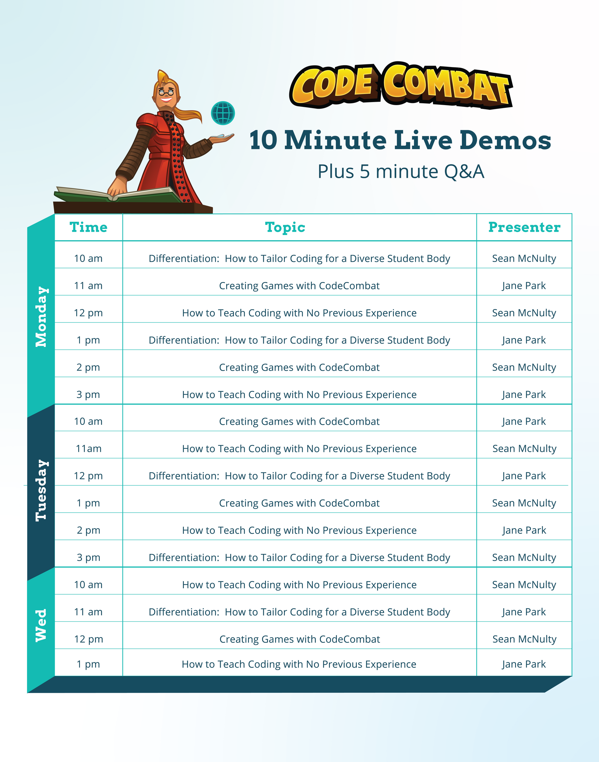 Want to learn more about teaching coding with no experience or creating games with CodeCombat? Everyday of the show we'll have informative live presentations right at the booth at various times so you don't have to miss a workshop or panel. After the presentation, try a hands-on demo and explore our teacher dashboard and try the game yourself!