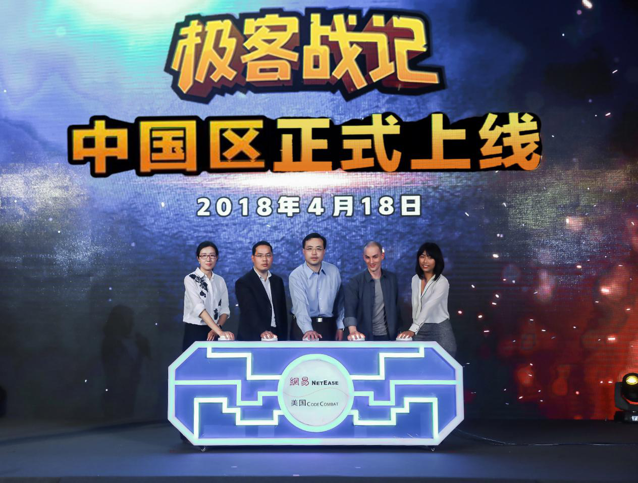 From left to right, Cao Zhiqing, CEO of NetEase Education STEM Division, Jiang Zhongbo, General Manager of NetEase Education, Bill Pang, NetEase Corporate VP, Nick Winter, CEO of CodeoCombat, Lisa Wu, BD Manager of CodeCombat
