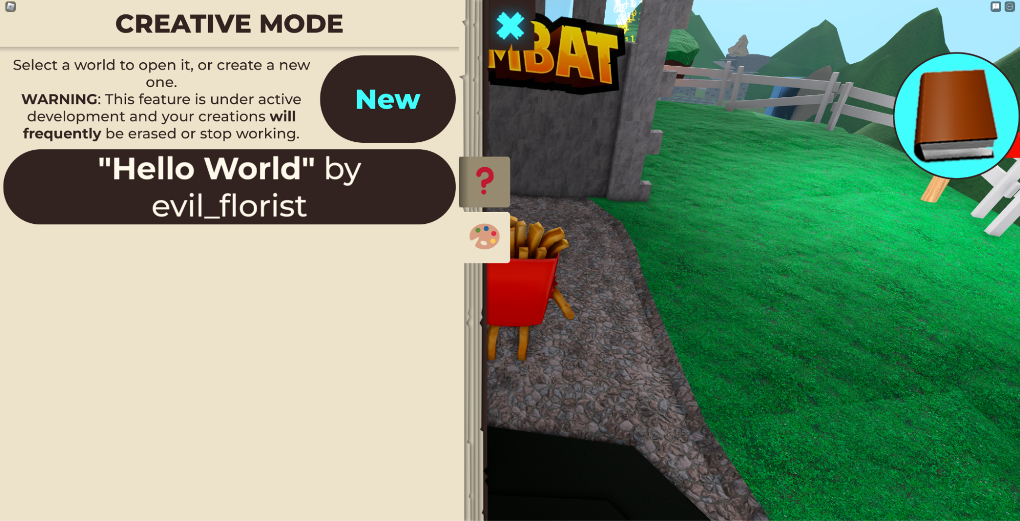 - To use creative mode, click the book icon 📕 in the right-hand corner. Then click on the artist palette icon 🎨. You can play what others have made or create your own by clicking "New."