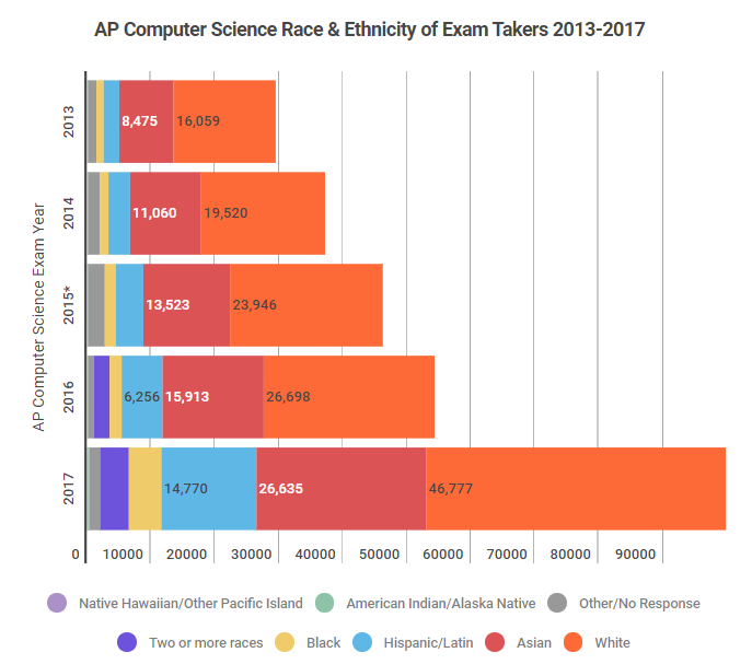 The College Board data confirms that while the amount of students taking the AP Computer Science exam has grown since 2013, the number of minority students taking the AP Computer Science exam remained largely unchanged until the introduction of AP Computer Science Principles in 2016.