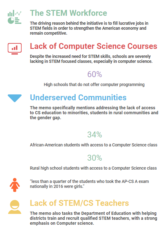 The President has tasked Secretary of Education, Betsy DeVos to make it a priority at the Department of Education to focus on expanding and promoting “high-quality” STEM and especially computer science Education when devoting existing grant funds in fiscal year 2018. All plans must be communicated to Mick Mulvaney, Director of the Office of Management and Budget (OMB Director) every year before funds are granted, including reports within 90 days after the end of the fiscal year outlining how grant funds were spent and how well they succeeded in expanding computer science access to students.